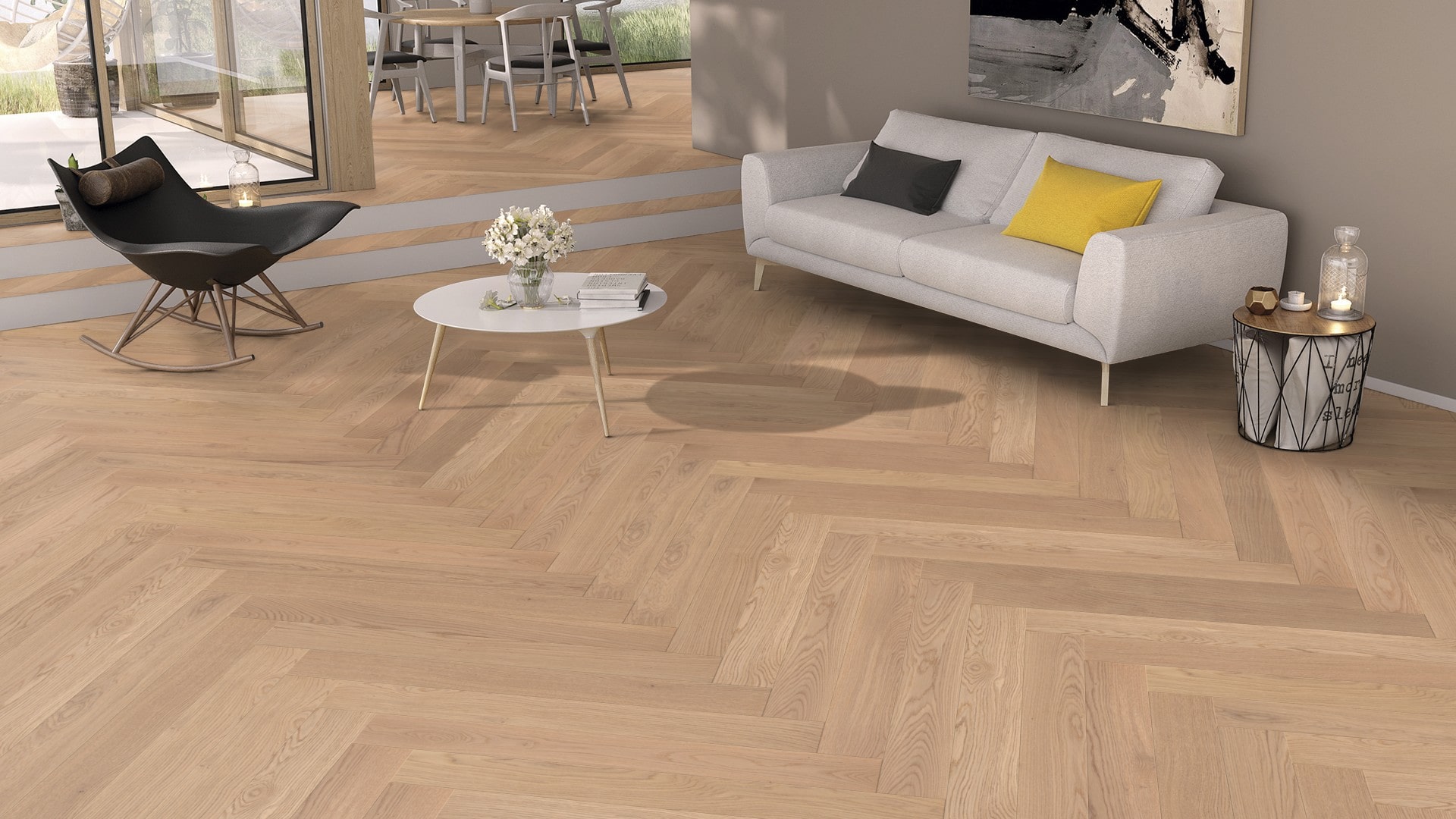 Parkett mit ruhiger Sortierung, kleine Äste, natürliche Farbunterschiede.
