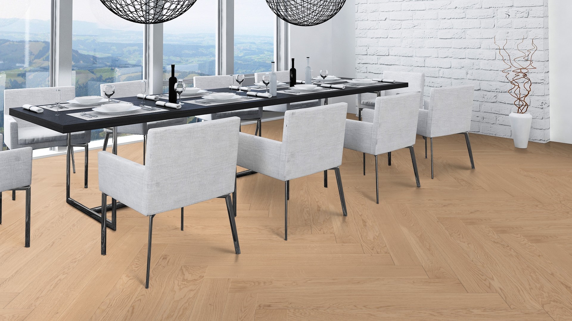 Außergewöhnlich große Auswahl durch Vielfalt an Holzarten, Veredelungen und Oberflächen. Passgenaue und formstabile Stirnseitenverbindung durch Einsatz von hochwertigem Sperrholz. Trägermaterial aus Holzwerkstoff. Intelligente Kombinationsmöglichkeiten mit WP 550 und WP 450. Ab 100 m² auf Bestellung auch für Fischgrät-Verlegung lieferbar.